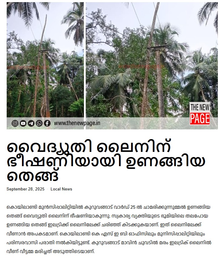 കൊയിലാണ്ടി നഗരസഭയില് കുറുവങ്ങാട് വാര്ഡ് 25 ല് ചാമരിക്കുന്നുമ്മല് വൈദ്യുതലൈനിലേക്ക് ചാഞ്ഞു നിന്ന ഉണങ്ങിയ തെങ്ങ് മുറിച്ചു മാറ്റി. കെ. എസ് ഇ ബി ജീവനക്കാരാണ് ശനിയാഴ്ച വൈകീട്ട് തെങ്ങ് മുറിച്ചു മാറ്റിയത്. സ്വകാര്യ വ്യക്തിയുടെ സ്ഥലത്തുളള തെങ്ങ് മുറിച്ചു മാറ്റാന് നിരന്തരമായി കെ.എസ് ഇ ബി അധികൃതര് ആവശ്യപ്പെട്ടിരുന്നെങ്കിലും തെങ്ങ് മുറിച്ച് നീക്കിയിരുന്നില്ല. ഇതു സംബന്ധിച്ച് വാര്ത്തകൾ ദി ന്യൂ പേജ് ഓൺലൈൻ ന്യൂസിൽ പ്രസിദ്ധീകരിച്ചിരുന്നു. സ്വകാര്യ വ്യക്തിയുടെ സ്ഥലത്തെ മരം മുറിച്ചു മാറ്റേണ്ടത് സ്ഥലമുടമയുടെ ഉത്തരവാദിത്വമാണ്. എന്നാല് അപകടകരമായ സാഹചര്യത്തില് തെങ്ങ് മുറിച്ചു മാറ്റാതെ വന്നപ്പോഴാണ് കെ. എസ് ഇ ബി അധികൃതര് തന്നെ അടിയന്തിര നടപടി സ്വീകരിച്ചത്.