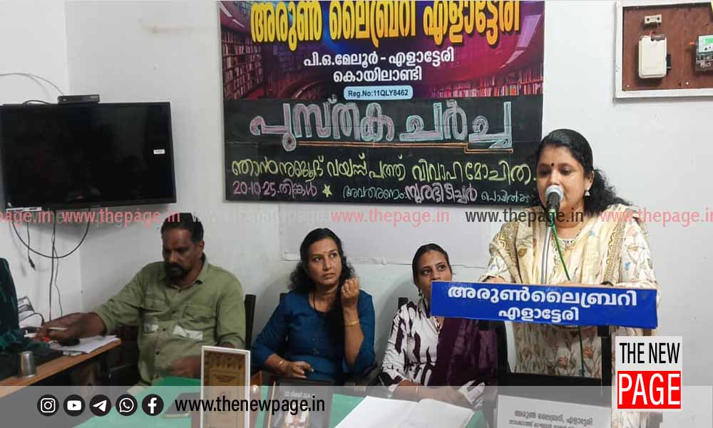 കൊയിലാണ്ടി എളാട്ടേരി അരുൺ ലൈബ്രറിയുടെ നേതൃത്വത്തിൽ പുസ്തക ചർച്ച നടത്തി. ഞാൻ നുജൂദ് വയസ്സ് പത്ത് വിവാഹമോചിത എന്ന പുസ്തകമാണ് ചർച്ച ചെയ്തത്. ലൈബ്രറി വനിതാവേദി പ്രസിഡണ്ട് കെ. റീന അധ്യക്ഷത വഹിച്ച ചടങ്ങിൽ സാംസ്കാരിക പ്രവർത്തകയും അധ്യാപികയുമായ സുരഭി ടീച്ചർ പുസ്തകാവതരണം നടത്തി. ലൈബ്രറി സെക്രട്ടറി ഇ. നാരായണൻ, പ്രസിഡണ്ട് എൻ. എം . നാരായണൻ മാസ്റ്റർ, കെ. ജയന്തി ടീച്ചർ, കെ. അനീഷ ടി.എം. ഷീജ എന്നിവർ സംസാരിച്ചു.