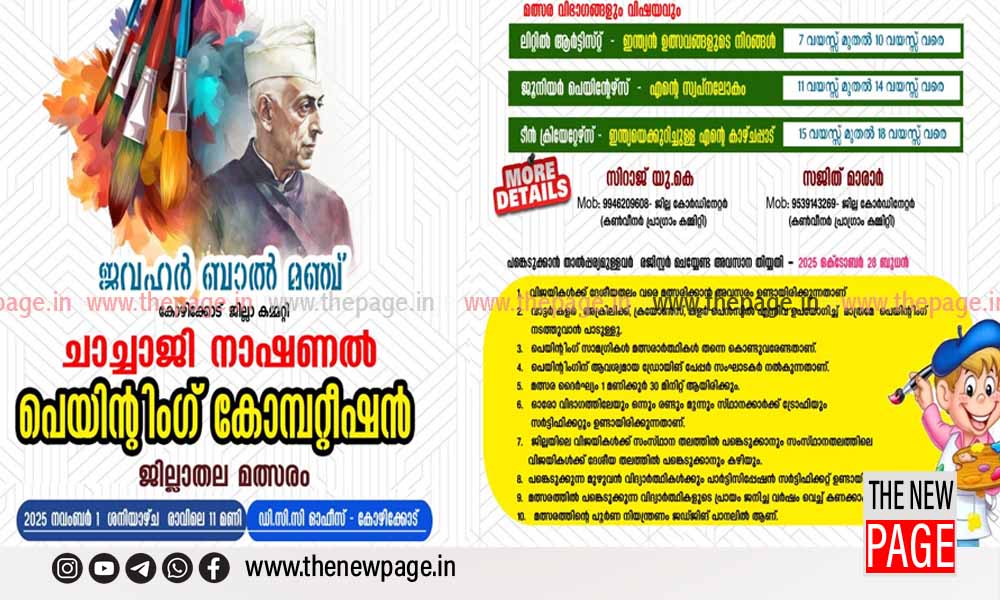 ജവഹർ ബാൽ മഞ്ച് കോഴിക്കോട് ജില്ലാ കമ്മിറ്റി സംഘടിപ്പിക്കുന്ന ചാച്ചാജി നാഷണൽ പെയിൻ്റിംഗ് കോമ്പറ്റീഷൻ ജില്ലാതല മത്സരം നവംബർ ഒന്നിന്