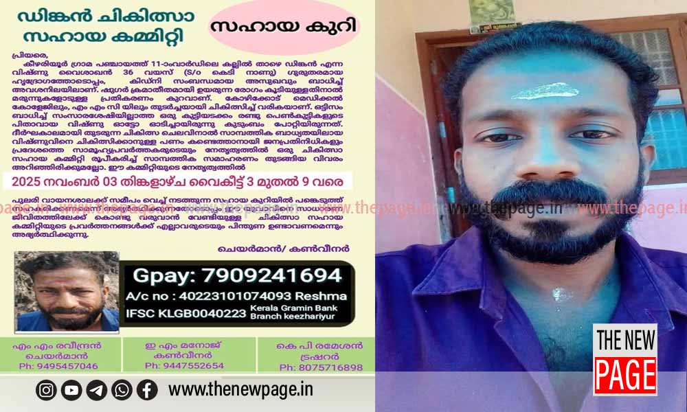 കീഴരിയൂർ ഗ്രാമ പഞ്ചായത്ത് 11-ാംവാർഡിലെ കല്ലിൽ താഴെ വിഷ്ണു വൈശാഖൻ (36) (ഡിങ്കൻ) ഗുരുതരമായ ഹൃദ്രോഗത്തോടൊപ്പം, കിഡ്നി സംബന്ധമായ അസുഖവും ബാധിച്ച് അവശനിലയിലാണ്. ഷുഗർ ക്രമാതീതമായി ഉയരുന്ന രോഗം കൂടിയുള്ളതിനാൽ മരുന്നുകളോടുള്ള പ്രതികരണം കുറവാണ്. കോഴിക്കോട് മെഡിക്കൽ കോളേജിലും, എം എം സി യിലും തുടർച്ചയായി ചികിത്സിച്ച് വരികയാണ്. ഓട്ടിസം ബാധിച്ച് സംസാരശേഷിയില്ലാത്ത ഒരു കുട്ടിയടക്കം രണ്ടു പെൺകുട്ടികളുടെ പിതാവായ വിഷ്ണു ഓട്ടോ ഓടിച്ചായിരുന്നു കുടുംബം നോക്കിയിരുന്നത്. ദീർഘകാലമായി തുടരുന്ന ചികിത്സ ചെലവിനാൽ സാമ്പത്തിക ബാധ്യതയിലായ വിഷ്ണുവിനെ ചികിത്സിക്കാനുള്ള പണം കണ്ടെത്താനായി ജനപ്രതിനിധികളും പ്രദേശത്തെ സാമൂഹ്യപ്രവർത്തകരുടെയും നേതൃത്വത്തിൽ ഒരു ചികിത്സാ സഹായ കമ്മിറ്റി രൂപീകരിച്ച് സാമ്പത്തിക സമാഹരണം തുടങ്ങിയിട്ടുണ്ട്. കമ്മിറ്റിയുടെ നേതൃത്വത്തിൽ 2025 നവംബർ 03 തിങ്കളാഴ്ച വൈകീട്ട് 4 മണി മുതൽ 9 മണി വരെ പുലരി വായനശാലക്ക് സമീപം വെച്ച് നടത്തുന്ന സഹായ കുറിയിൽ പങ്കെടുത്ത് നിങ്ങളാൽ കഴിയുന്ന സഹായം ചെയ്യണമെന്ന് അറിയിക്കുന്നതോടൊപ്പം ഈ യുവാവിനെ സാധാരണ ജീവിതത്തിലേക്ക് തിരിച്ചു കൊണ്ടുവരുവാൻ .എം.എം രവീന്ദ്രൻ ചെയർമാനും,ഇ എം മനോജ് കൺവീനറും, കെ പി രമേശൻ ട്രഷറാറായും . കീഴരിയൂർ ഗ്രാമീൺ ബാങ്കിൽ വിഷ്ണുവൈശാഖന് വേണ്ടി ഒരു അകൗണ്ടും ആരംഭിച്ചിട്ടുണ്ട്. A/c no: 40223101074093, IFടc KL G O O 40 223. GP No: 7909241694