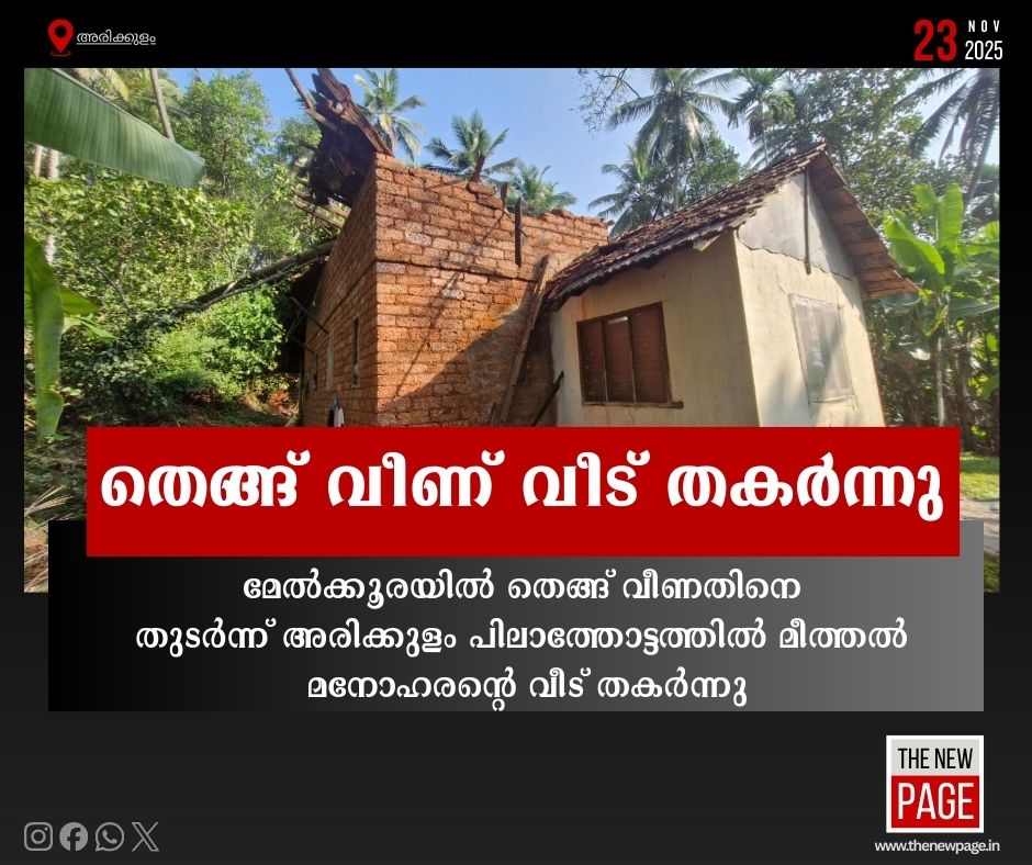 മേൽക്കൂരയിൽ തെങ്ങ് വീണതിനെ തുടർന്ന് അരിക്കുളം ഗ്രാമ പഞ്ചായത്ത് വാർഡ് 11 ൽ പെട്ട പിലാത്തോട്ടത്തിൽ മീത്തൽ മനോഹരന്റെ വീട് തകർന്നു. വെള്ളിയാഴ്ച പുലർച്ചെ 2.45ഓടെയായിരുന്നു സംഭവം. വീട്ടുകാർ ഉറക്കത്തിൽ ആയ സമയത്ത് ആണ് സംഭവം. മനോഹരൻ -ബിന്ദു ദമ്പതി കളുടെ മകൻ ലാലുവിന് സാരമായ പരിക്ക് പറ്റുകയുണ്ടായി.ഏകദേശം മൂന്ന് ലക്ഷം രൂപയുടെ നഷ്ടം വന്നതായി മനോഹരൻ പറഞ്ഞു. കുടുംബാംഗങ്ങൾ താമസം തല്ക്കാലം ബന്ധു വീട്ടിലേക്ക് മാറിയിരിക്കുകയാണ്.വില്ലേജ് ഓഫീസിലും ഗ്രാമ പഞ്ചായത്ത് ഓഫീസിലും പരാതി നൽകിയിട്ടുണ്ട്.കൂലി പണിക്കാരനായ മനോഹരൻ അധികൃതരിൽ നിന്നും സഹായം ഉണ്ടാകും എന്ന പ്രതീക്ഷയിലാണ്.