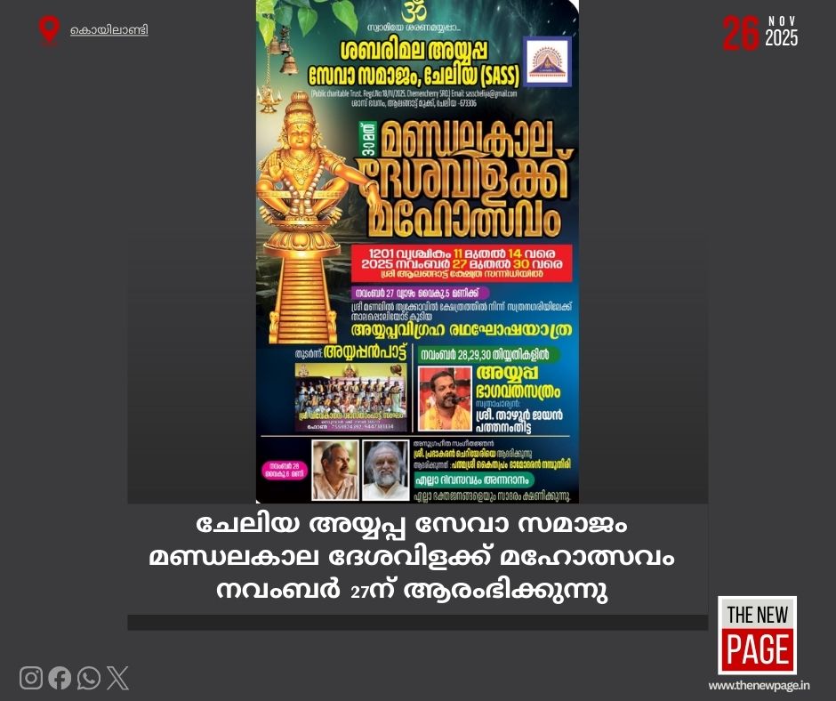 കൊയിലാണ്ടി: ചേലിയ ശബരിമല അയ്യപ്പ സേവാ സമാജം മണ്ഡലകാല ദേശവിളക്ക് മഹോത്സവത്തിന് നവംബര് 27ന് തുടക്കമാകും. രാവിലെ ഗണപതിഹോമം,ലളിതാ സഹസ്രനാമാര്ച്ചന. വൈകിട്ട് മണലില് തൃക്കോവില് ക്ഷേത്രത്തില് നിന്നും ആലങ്ങാട്ട് ക്ഷേത്രത്തില് ഒരുക്കിയ അയ്യപ്പ സത്ര യജ്ഞ വേദിയിലേക്ക് താലപ്പൊലി,വിഗ്രഹ രഥഘോഷയാത്ര. തൃശ്ശൂര് നെടുമ്പാള് വിവേകാനന്ദ ശാസ്താംപാട്ട് സംഘം അവതരിപ്പിക്കുന്ന അയ്യപ്പന് പാട്ട്. 27 മുതല് 30 വരെ യജ്ഞാചാര്യന് താഴൂര് ജയന് നയിക്കുന്ന അയ്യപ്പ ഭാഗവത സത്രം.