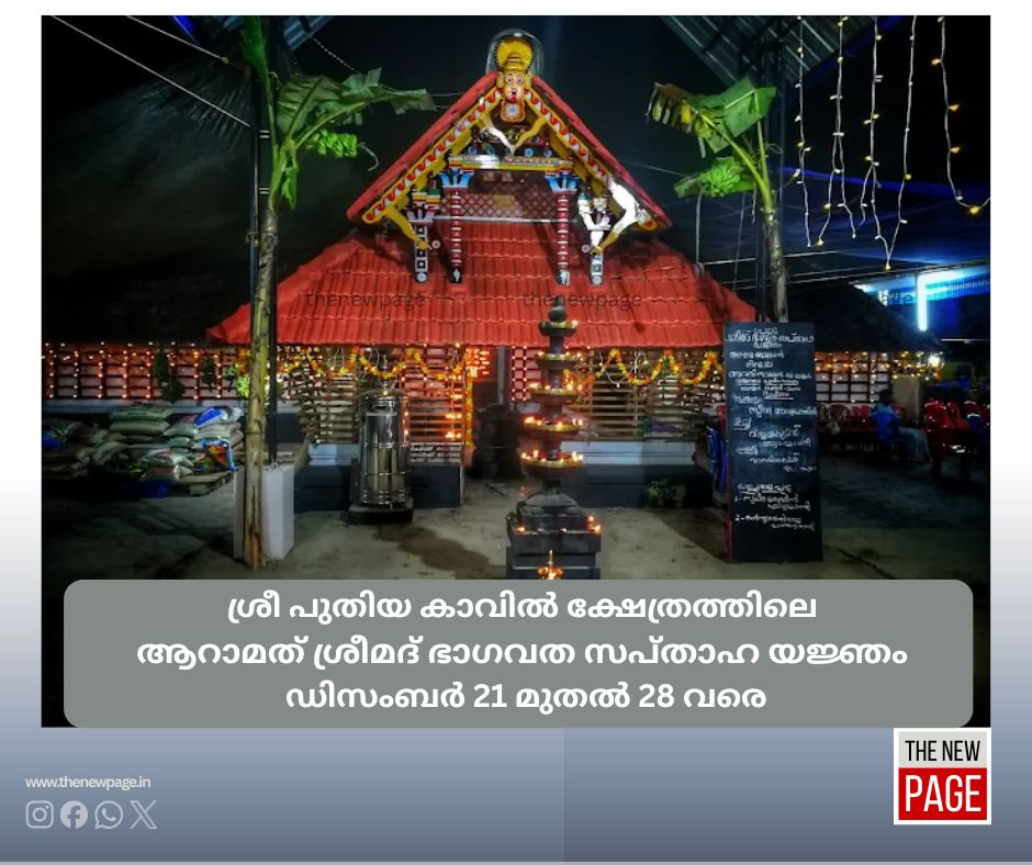 കുറുവങ്ങാട്, ശ്രീ പുതിയ കാവിൽ ക്ഷേത്രത്തിലെ ആറാമത് ശ്രീമദ് ഭാഗവത സപ്താഹ യജ്ഞം, 2025 ഡിസംബർ 21 ഞായറാഴ്ച മുതൽ , 28 ഞായറാഴ്ച വരെ പൂർവ്വാധികം ഭംഗിയായി നടത്തപ്പെടുന്നു. യജ്ഞാചാര്യൻ ബ്രഹ്മശ്രീ പഴേടം വാസുദേവൻ നമ്പൂതിരി. സപ്താഹ കമ്മിറ്റി ചെയർമാൻ ശ്രീ ജ ടീച്ചർ കേളോത്ത്, കൺവീനർ സുജിത്ത്കുമാർ പുതിയ കാവിൽ, ട്രഷറർ ബാലകൃഷ്ണൻ മാണിക്ക്യ, ക്ഷേത്ര പരിപാലന സമിതി പ്രസിഡണ്ട് ബിജു സി പി, സിക്രട്ടറി ബാലകൃഷ്ണൻ പി ടി.