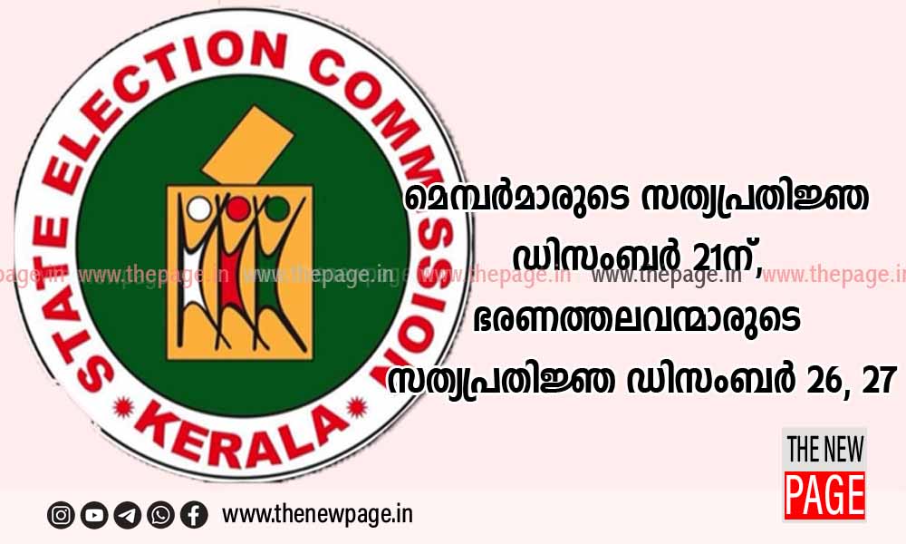 ഗ്രാമ, ബ്ലോക്ക്, ജില്ല പഞ്ചായത്തുകളിലേയ്ക്കും, മുൻസിപ്പാലിറ്റിയിലേയ്ക്കും തിരഞ്ഞടുക്കപ്പെട്ട മെമ്പർമാരുടെ സത്യപ്രതിജ്ഞ ഡിസംബർ 21 ഞായറാഴ്ച രാവിലെ 10 മണിക്ക് നടക്കും. കോർപ്പറേഷനിലേയ്ക്ക്