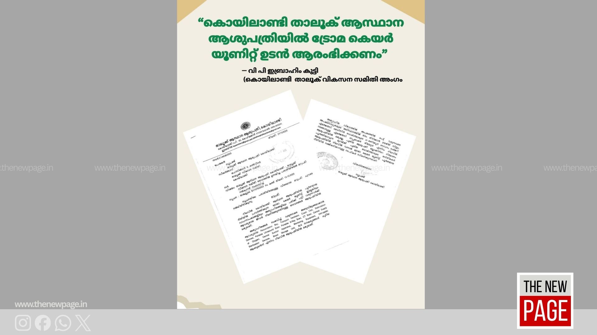 വാഹനാപകടങ്ങളിലും അത്യാഹിതങ്ങളിലും പരിക്ക് പറ്റി വരുന്നവരുടെ എണ്ണം അനുദിനം കൂടി കൂടി വരുന്ന സാഹചര്യത്തിൽ ഉടൻ ട്രോമ കെയർ യൂണിറ്റ് ആരംഭിക്കണമെന്ന് കേരള സർക്കാരിനോടും ഹെൽത്ത് ഡിപ്പാർട്ട്മെന്റിനോടും താലൂക് വികസന സമിതിയിൽ ആവശ്യപ്പെടുന്ന പ്രമേയം താലൂക് വികസന സമിതി അംഗം വി പി ഇബ്രാഹിം കുട്ടി അവതരിപ്പിച്ചു. പ്രമേയം ഐക്യകണ്ഠേന യോഗം അംഗീകരിച്ചു.