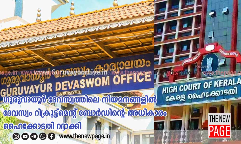 ഗുരുവായൂർ ദേവസ്വം എംപ്ലോയീസ് യൂണിയൻ കോൺഗ്രസ് നൽകിയ അപ്പീലിൽ ഗുരുവായൂർ ദേവസ്വത്തിലെ നിയമനങ്ങളിൽ ദേവസ്വം റിക്രൂട്ട്മെൻ്റ് ബോർഡിൻ്റെ അധികാരം ഹൈക്കോടതി ഡിവിഷൻ ബെഞ്ച് റദ്ദാക്കി. നിയമനത്തിനുള്ള അധികാരം ദേവസ്വം മാനേജ്മെൻ്റ് കമ്മിറ്റിക്കാണെന്നും ഇതിന് മേൽനോട്ടം വഹിക്കാൻ പ്രത്യേക സമിതിയുണ്ടാകുമെന്നും കോടതി വ്യക്തമാക്കി. നിയമനത്തിനായി ദേവസ്വം റിക്രൂട്ട്മെൻ്റ് ബോർഡ് ഇറക്കിയ വിജ്ഞാപനങ്ങൾ റദ്ദാക്കിയ കോടതി സുതാര്യത ഉറപ്പാക്കാൻ മൂന്നംഗ മേൽനോട്ടസമിതിയെ നിയോഗിച്ചു.