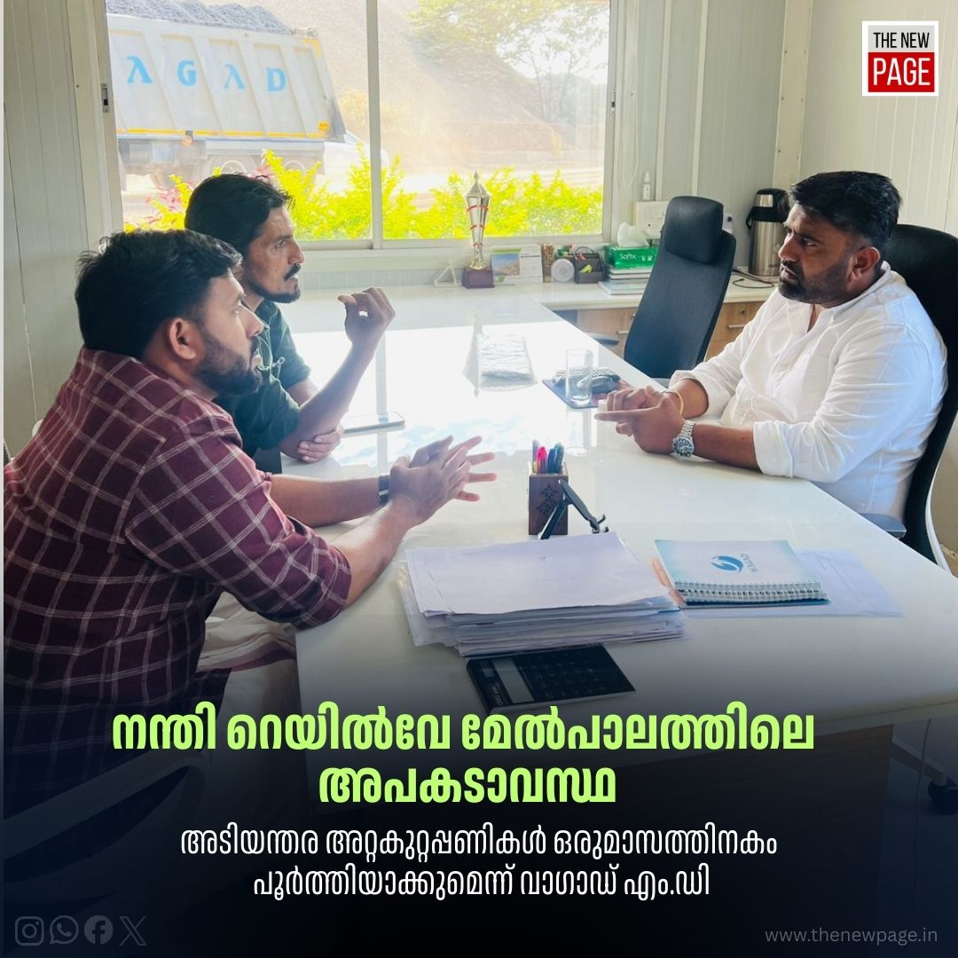 നന്തി ബസാർ: നന്തി റെയിൽവേ മേൽപ്പാലത്തിന്റെ ശോചനീയാവസ്ഥ അടിയന്തരമായി പരിഹരിക്കണമെന്നാവശ്യപ്പെട്ട് വാഗാഡ് കമ്പനി എം.ഡി. സ്രാവൻ ജെയിനുമായി പന്തലായനി ബ്ലോക്ക് പഞ്ചായത്ത് അംഗം പി.കെ. മുഹമ്മദലിയും വാർഡ് അംഗം അനസ് ആയടത്തിലും നേരിട്ട് ചർച്ച നടത്തി.