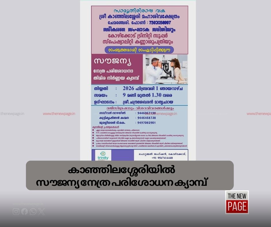 ശ്രീ കാഞ്ഞിലശ്ശേരി മഹാശിവക്ഷേത്ര നവീകരണ സമിതിയും കോഴിക്കോട് ട്രിനിറ്റി സൂപ്പർ സ്പെഷ്യാലിറ്റി കണ്ണാശുപത്രിയും ചേർന്ന് സൗജന്യ നേത്ര പരിശോധന ക്യാമ്പ് സംഘടിപ്പിക്കുന്നു.