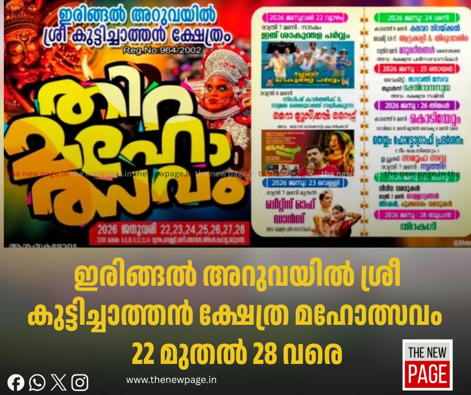 ഇരിങ്ങൽ അറുവയിൽ ശ്രീ കുട്ടിച്ചാത്തൻ ക്ഷേത്ര മഹോത്സവം 22ന് തുടങ്ങും. 22ന് രാത്രി 7 മണിക്ക് നാടകം “ഇത് ശാകുന്തള പർവ്വം”. എട്ടുമണിക്ക് മെഗാ മ്യൂസിക് നൈറ്റ്. 23ന് രാവിലെ ഏഴു മുതൽ ബസ്റ്റ് ഓഫ് ഡാൻസ്, 24ന് കാലത്ത് 8:00 കലവറ നിറക്കൽ. വൈകിട്ട് 6 30ന് ആട്ടക്കളിയും, തിരുവാതിരയും. 25ന് വൈകീട്ട് ഭഗവതി സേവ, ഭക്തി ഗാനസുധ. 26ന് കാലത്ത് എട്ടുമണിക്ക് കൊടിയേറ്റം 11 മുതൽ 4 മണി വരെ തെയ്യം ഫോട്ടോഗ്രാഫി മത്സരം. 27 ന് വിവിധ വരവുകൾ. ഏഴുമണിക്ക് വെള്ളാട്ടുകൾ, തിറകൾ, പൂക്കലം വരവുകൾ. 28ന് തിറകൾ.