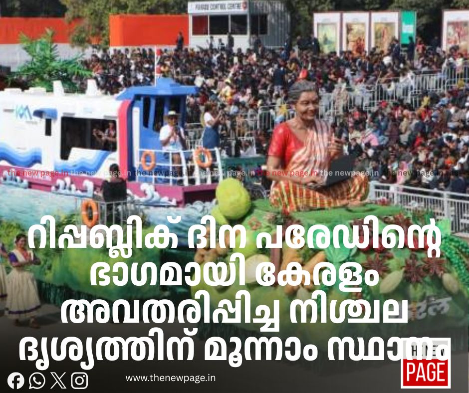 റിപ്പബ്ലിക് ദിന പരേഡിന്റെ ഭാഗമായി കേരളം അവതരിപ്പിച്ച നിശ്ചല ദൃശ്യത്തിന് മൂന്നാം സ്ഥാനം. 12 വർഷത്തിന് ശേഷമാണ് കേരളം റിപ്പബ്ലിക് ദിന പരേഡിൽ മെഡൽ പട്ടികയിൽ ഇടം നേടുന്നത്. മുപ്പതിലധികം ടാബ്ലോകളിൽ നിന്നാണ് കേരളത്തിൻ്റെ വികസന നേട്ടമായ കൊച്ചി വാട്ടർ മെട്രോയും ഡിജിറ്റൽ സാക്ഷരതയിലെ നൂറു ശതമാനം നേട്ടവും എടുത്തു കാട്ടിയ ടാബ്ലോ തെരഞ്ഞെടുക്കപ്പെട്ടത്.