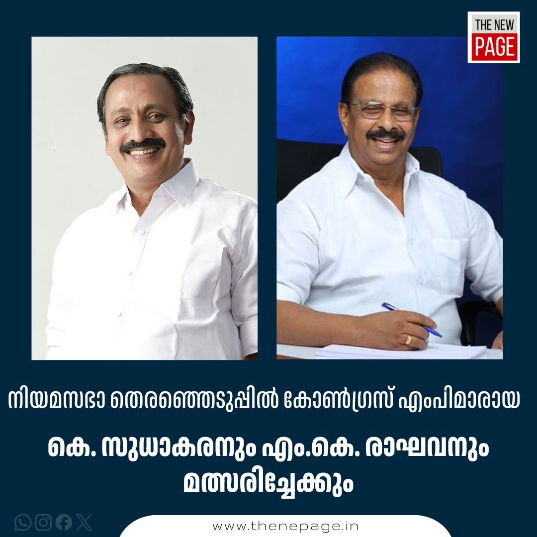 നിയമസഭാ തെരഞ്ഞെടുപ്പിൽ കോൺഗ്രസ് എംപിമാരായ കെ. സുധാകരനും എം.കെ. രാഘവനും മത്സരിച്ചേക്കുമെന്ന് സൂചന. സർവേ റിപ്പോർട്ടിന്റെ അടിസ്ഥാനത്തിലാണ് ഹൈക്കമാൻഡ് തീരുമാനമെടുക്കുന്നത്. സുധാകരൻ കണ്ണൂരിലും രാഘവൻ കോഴിക്കോടുമാണ് മത്സരിക്കുക. കോന്നിയിൽ അടൂർ പ്രകാശിനെ മത്സരിപ്പിക്കണമെന്ന നിർദേശവും ഉയർന്നിട്ടുണ്ട്. എന്നാൽ അടൂർ പ്രകാശിനെ മത്സരിപ്പിക്കുന്നത് തിരിച്ചടിയാകുമെന്ന വിലയിരുത്തലിലാണ് എ ഗ്രൂപ്പ്.