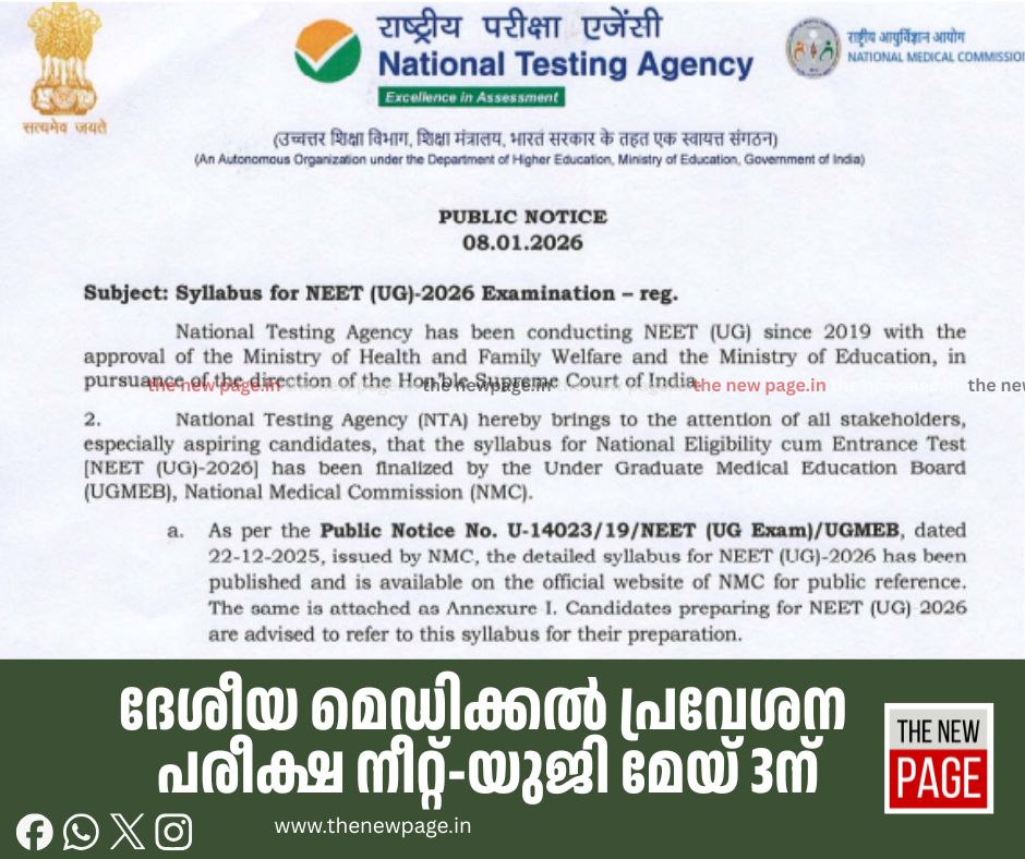 ദേശീയ മെഡിക്കൽ പ്രവേശന പരീക്ഷയായ നീറ്റ്-യുജി മേയ് 3ന് നടക്കും. പരീക്ഷയ്ക്ക് തയാറെടുക്കുന്ന വിദ്യാർത്ഥികൾക്ക് മാർച്ച് 8 വരെ ഓൺ ലൈനായി രജിസ്റ്റർ ചെയ്യാം. അപേക്ഷയിലെ ചില ഭാഗങ്ങളിൽ മാത്രം പിന്നീടു തിരുത്തൽ വരുത്താനുള്ള അവസരം മാർച്ച് 10 മുതൽ 12 വരെ അനുവദിക്കും. പേന, പേപ്പർ മോഡിൽ ഒറ്റ ഷിഫ്റ്റായാണ് പരീക്ഷ. മലയാളം ഉൾപ്പെടെ 13 ഭാഷകളിൽ പരീക്ഷ എഴുതാം. ഈ ഭാഷകളിൽ ചോദ്യ പേപ്പറുകളും ഉണ്ടാകും. കേരളത്തിലും ലക്ഷദ്വീപിലും മാത്രമാണ് മലയാളം ചോദ്യ പേപ്പറുകൾ അനുവദിക്കുക.