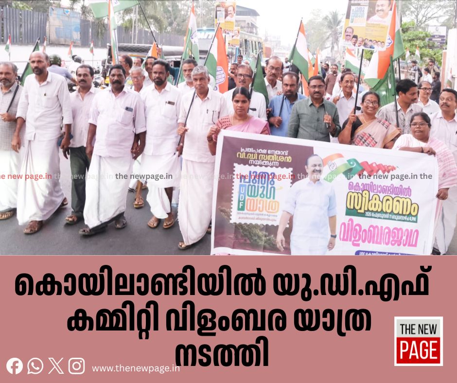 കൊയിലാണ്ടി പ്രതിപക്ഷ നേതാവ് വി.ഡി സതീശൻ നയിക്കുന്ന പുതുയുഗയാത്രയുടെ കൊയിലാണ്ടിയിലെ സ്വീകരണത്തിൻ്റെ പ്രചരണാർത്ഥം മുൻസിപ്പൽ യു.ഡി.എഫ് കമ്മിറ്റി കൊയിലാണ്ടി ടൗണിൽ വിളംബ ജാഥ നടത്തി. മഠത്തിൽ നാണു മാസ്റ്റർ, മഠത്തിൽ അബ്ദു റഹമാൻ, മുരളി തോറോത്ത്, രാജേഷ് കീഴരിയൂർ, കെ.പി.വിനോദ് കുമാർ, അൻവ്വർ ഇയ്യഞ്ചേരി, വി.വി സുധാകരൻ, വി.പി. ഇബ്രാഹിം കുട്ടി, വി.പി. ഭാസ്ക്കരൻ, അനീഫ മസ്റ്റർ, വി.ടി സുരേന്ദ്രൻ, തൻഹീർ കൊല്ലം, ശ്രീജാ റാണി, കെ.വി. റീന, എ. അസ്സീസ്, കുമുള്ളി കരുണൻ എന്നിവർ നേതൃത്വം നൽകി.