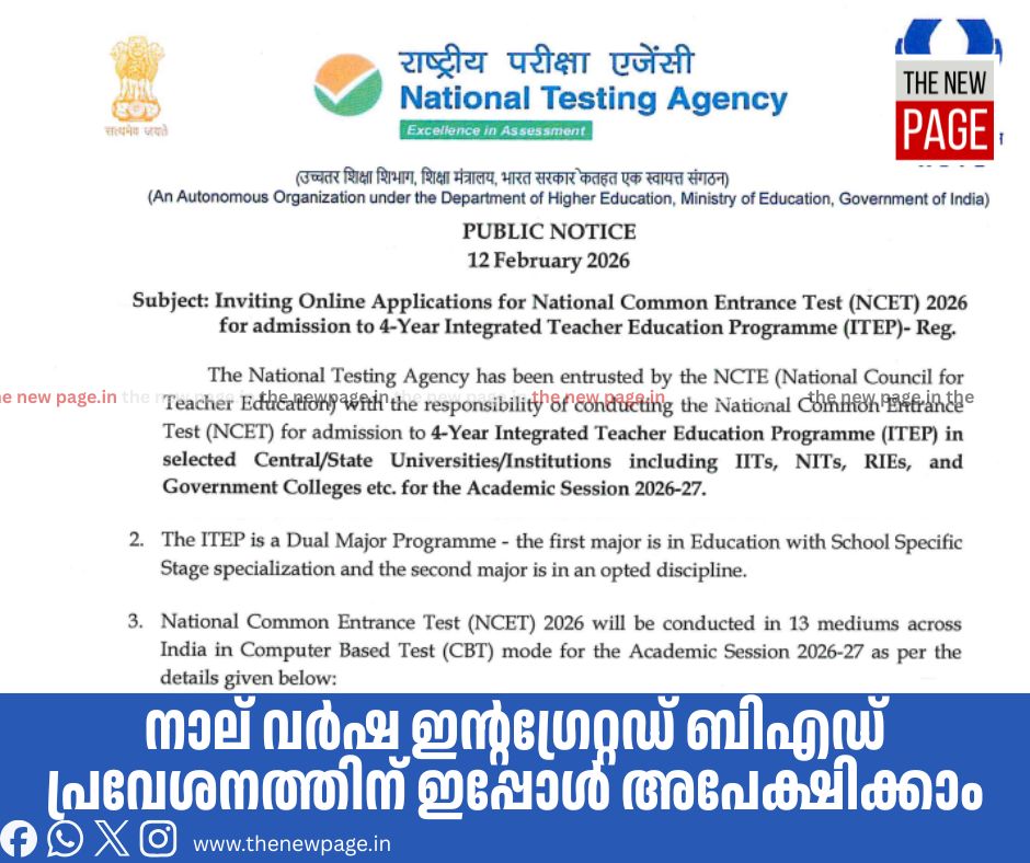 നാഷണൽ കോമൺ എൻട്രൻസ് ടെസ്റ്റ് (എൻസിഇടി) വഴി നാല് വർഷ ഇന്റഗ്രേറ്റഡ് ബിഎഡ് പ്രവേശനത്തിന് ഇപ്പോൾ അപേക്ഷിക്കാം. ഇന്റഗ്രേറ്റഡ് ടീച്ചർ എജ്യുക്കേഷൻ പ്രോഗ്രാ (ഐടിഇപി) മിന് കേരളത്തിൽ ഈ വർഷം ആകെ 850 സീറ്റുകൾ ഉണ്ട്. വിവിധ ഐഐടികൾ, എൻഐടികൾ, കേന്ദ്ര, സംസ്ഥാന സർവകലാശാലകൾ, സർക്കാർ കോളേജുകൾ എന്നിവിടങ്ങളിലുൾപ്പെടെ രാജ്യത്ത് ആകെ പതിനേഴായിരത്തോളം സീറ്റുകളിലേക്കാണ് പ്രവേശനം നടക്കുക. നാല് വർഷ ഇന്റഗ്രേറ്റഡ് ബിഎഡ് കോഴ്സിലൂടെ എജ്യുക്കേഷനോടൊപ്പം സയൻസ്, ആർട്സ്, കൊമേഴ്സ് സ്ട്രീമുകളിലൊന്നിലുമായി ഇരട്ട ബിരുദം കരസ്ഥമാക്കാം. 2025 ഏപ്രിൽ 17നാണ് കമ്പ്യൂട്ടർ അധിഷ്ഠിത പ്രവേശനപരീക്ഷ നടക്കുക.