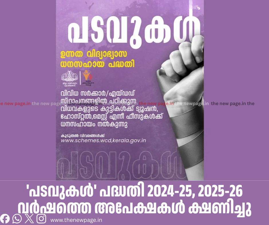 വനിതാ ശിശു വികസന വകുപ്പ് മുഖേന വിധവകളായ സ്ത്രീകളുടെ മക്കൾക്ക് പ്രഫഷണൽ കോഴ്സുകളിൽ പഠിക്കുന്നതിന് സർക്കാർ ധനസഹായം അനുവദിക്കുന്ന പടവുകൾ പദ്ധതിയിലേക്ക് ഇപ്പോൾ അപേക്ഷിക്കാം. മെറിറ്റ് അടിസ്ഥാനത്തിൽ സർക്കാർ, സർക്കാർ എയ്ഡഡ് സ്ഥാപങ്ങളിൽ പ്രവേശനം നേടിയ വിദ്യർത്ഥികൾക്കാണ് ധനസഹായം. കുടുംബ വാർഷിക വരുമാനം 3 ലക്ഷം രൂപയിൽ താഴെ ആയിരിക്കണം. വിദ്യാർത്ഥികളുടെ ട്യൂഷൻ ഫീസ്, ഹോസ്റ്റൽ ഫീസ്, മെസ് ഫീസ് എന്നിവയ്ക്ക് ധനസഹായം നൽകുന്നതാണ് ‘പടവുകൾ’ പദ്ധതി. 2024-25, 2025-26 വർഷത്തെ അനുകൂല്യങ്ങൾക്കാണ് അപേക്ഷ ക്ഷണിച്ചത്. മാർച്ച് 20നകം അപേക്ഷ സമർപ്പിക്കണം. വിശദവിവരങ്ങൾക്ക്: http://schemes.wcd.kerala.gov.in സന്ദർശിക്കുക. കൂടുതൽ വിവരങ്ങൾക്ക് ബന്ധപ്പെട്ട അങ്കണവാടി ശിശു വികസന പദ്ധതി ഓഫീസറുടെ കാര്യാലയത്തിൽ (ICDS Office) ബന്ധപ്പെടുക.