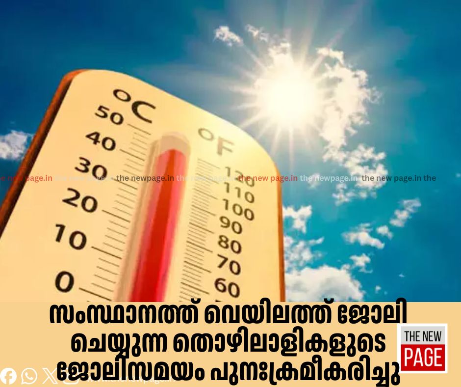 സംസ്ഥാനത്ത് പകൽ താപനില ക്രമാതീതമായി ഉയർന്നതോടെ വെയിലത്ത് ജോലി ചെയ്യുന്ന തൊഴിലാളികളുടെ ജോലിസമയം പുനഃക്രമീകരിച്ചു. രാവിലെ ഏഴ് മുതൽ വൈകിട്ട് ഏഴ് വരെയുള്ള സമയത്തിനുള്ളിൽ ജോലിസമയം എട്ട് മണിക്കൂറായി നിജപ്പെടുത്തി തൊഴിൽവകുപ്പ് ഉത്തരവിറക്കി. മേയ് 20 വരെയാണ് ക്രമീകരണം.