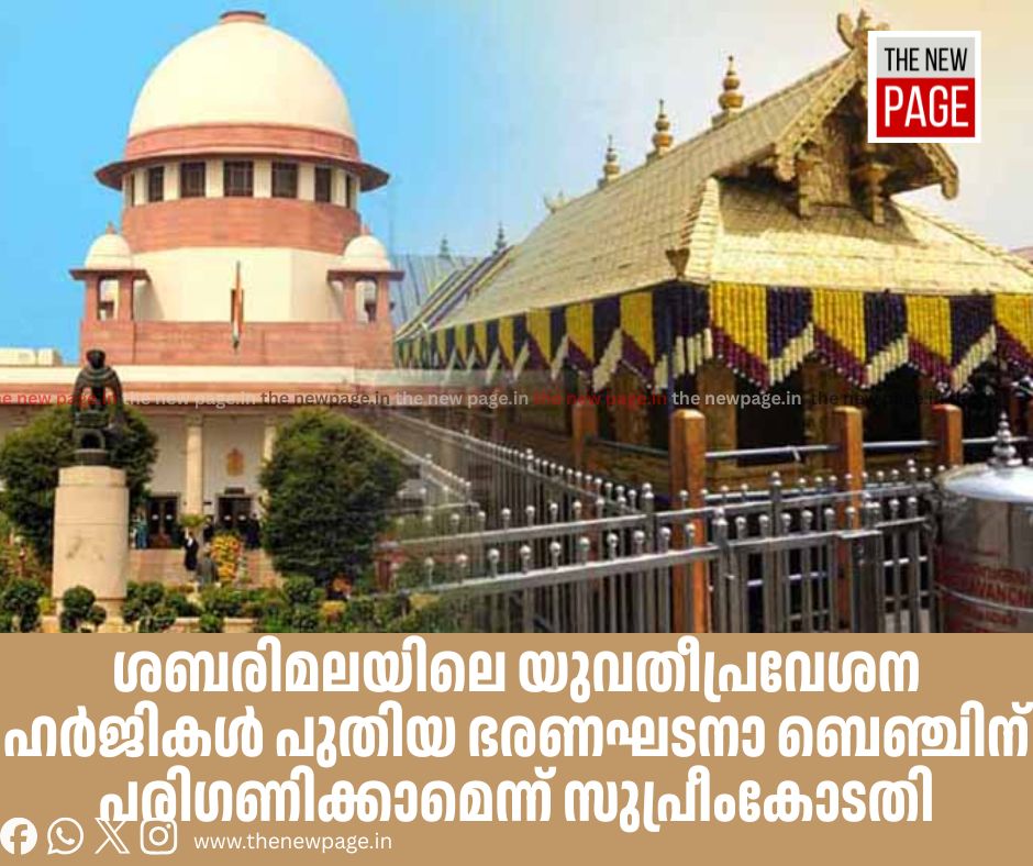 ശബരിമലയിലെ യുവതീപ്രവേശന ഹർജികൾ പുതിയ ഭരണഘടനാ ബെഞ്ചിന് പരിഗണിക്കാമെന്ന് സുപ്രീംകോടതി. ചീഫ് ജസ്റ്റിസ് ആയിരിക്കും ഒമ്പതംഗ ബെഞ്ചിന് നേതൃത്വം നൽകാൻ സാധ്യത. ഇക്കാര്യം നേരത്തെ നിശ്ചയിച്ചതാണെന്നും കോടതി വ്യക്തമാക്കി. എല്ലാ കക്ഷികളും മാർച്ച് 14ന് മുമ്പ് നിലപാട് എഴുതി നൽകാനും കോടതി നിർദേശിച്ചു. 9 അംഗ ബെഞ്ച് ഏപ്രിൽ 7ന് വാദം തുടങ്ങും.