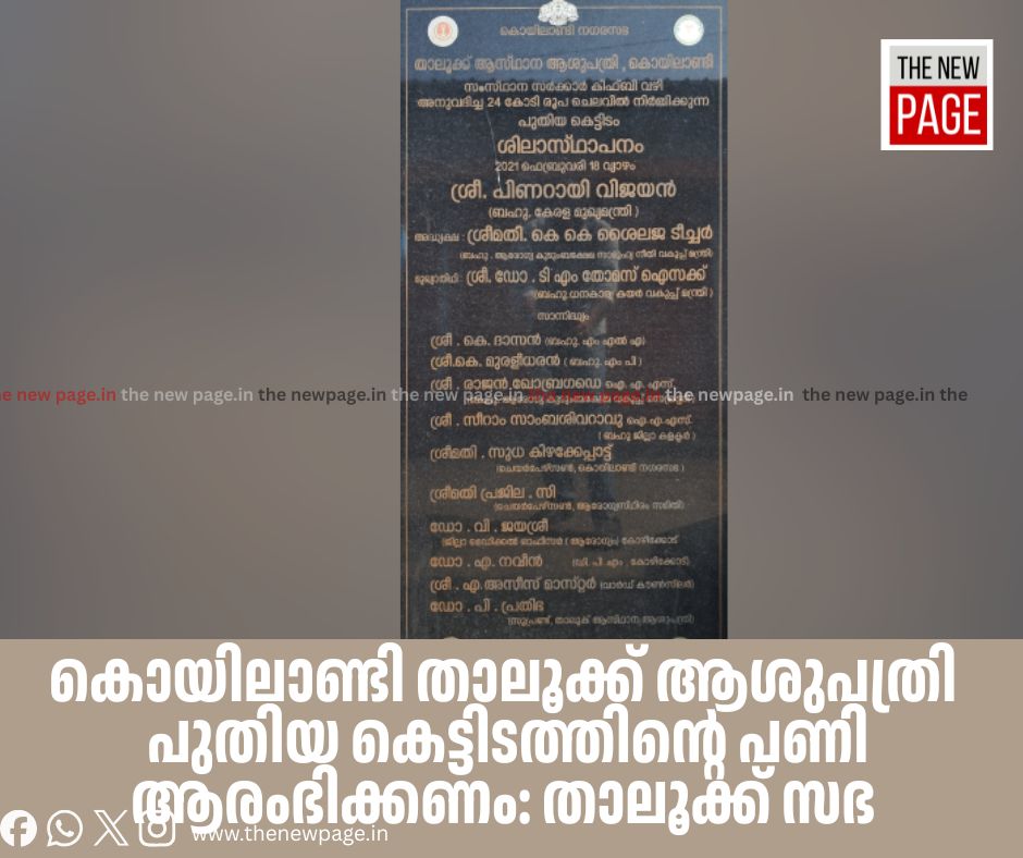 കൊയിലാണ്ടി താലൂക്ക് ആശുപത്രി പുതിയ കെട്ടിടത്തിൻ്റെ ശിലാസ്ഥാപനം 2021 ഫിബ്രവരി 18 ന് നിർവഹിച്ച് 5 വർഷം പൂർത്തിയായിട്ടും പഴയ കെട്ടിടം പൊളിച്ചു മാറ്റിയതല്ലാതെ കെട്ടിടം പണി ഇതുവരെ തുടങ്ങാൻ സാധിച്ചിട്ടില്ല. ഹോസ്പിറ്റലിൽ മോർച്ചറി കെട്ടിടവും പൊളിച്ചു മാറ്റിയതിനാൽ പോസ്റ്റ്മോർട്ടം നടക്കാത്തതും വർഷങ്ങളായി. താൽക്കാലിക കെട്ടിടം നിർമ്മിച്ചു പോസ്റ്റ്മോർട്ടം ആരംഭിക്കണമെന്നും താലൂക്ക് സഭയിൽ രാജേഷ് കീഴരിയൂർ ആവശ്യപ്പെട്ടു. ഇ.കെ അജിത് അധ്യക്ഷത വഹിച്ചു. തഹസിൽദാർ ജയശ്രീ വാര്യർ, വി.പി ഇബ്രാഹിം കുട്ടി, രാജൻ വർക്കി ഉദ്യോഗസ്ഥ പ്രതിനിധികൾ തുടങ്ങിയവർ സംസാരിച്ചു.