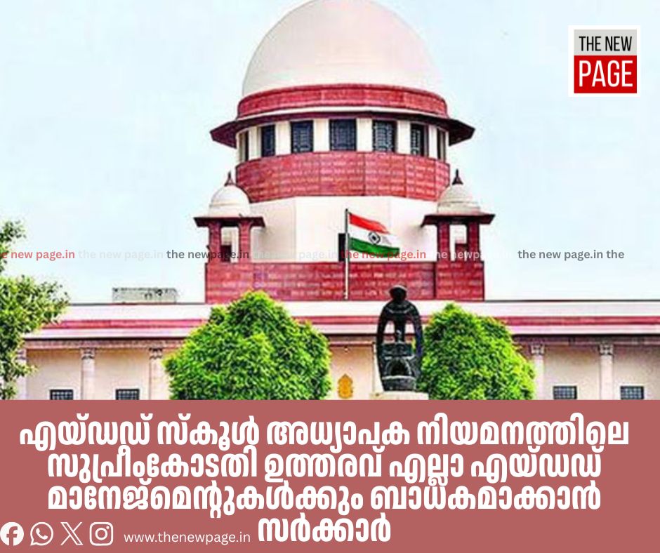 എയ്ഡഡ് സ്കൂൾ അധ്യാപക നിയമനത്തിലെ സുപ്രീംകോടതിയുടെ ഉത്തരവ് എല്ലാ എയ്ഡഡ് മാനേജ്മെന്റുകൾക്കും ബാധകമാക്കാൻ സർക്കാർ നടപടികൾ തുടങ്ങി. ഇതുമായി ബന്ധപ്പെട്ട ഉത്തരവ് ഉടൻ പുറത്തിറങ്ങിയേക്കും. ഭിന്നശേഷി സംവരണത്തിൽ എൻ.എസ്.എസിന് അനുകൂലമായ ഉത്തരവ് എല്ലാ എയ്ഡഡ് മാനേജ്മെന്റുകൾക്കും ബാധകമാക്കാനാണ് വിദ്യാഭ്യാസ വകുപ്പ് ഒരുങ്ങുന്നത്. ഭിന്നശേഷി സംവരണത്തിന് 4% ഒഴിവുകൾ മാറ്റിവച്ച് ബാക്കിയുള്ള ഒഴിവുകളിൽ സ്ഥിരം അധ്യാപക നിയമനം നടത്തുന്നതിന് എല്ലാ മാനേജ്മെന്റുകൾക്കും അനുവാദം കൊടുക്കുകയാണ് ചെയ്യുക. എൻഎസ് എസിന് സുപ്രീം കോടതി നൽകിയ ഈ ഉത്തരവ് എല്ലാ മാനേജ്മെന്റുകൾക്കും ബാധകമാക്കിയുള്ള ഉത്തരവാണ് ഇറങ്ങുക.