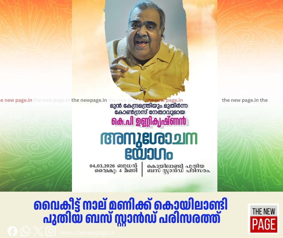 കെ.പി. ഉണ്ണികൃഷ്ണൻ്റെ നിര്യാണത്തിൽ അനുശോചന യോഗം ഇന്ന് കൊയിലാണ്ടിയിൽMarch 4, 2026Local Newsമുൻ കേന്ദ്ര മന്ത്രിയും മുതിർന്ന കോൺഗ്രസ് നേതാവുമായ കെ.പി. ഉണ്ണികൃഷ്ണൻ്റെ നിര്യാണത്തിൽ അനുശോചന യോഗം ഇന്ന് (മാർച്ച് നാലിന്) വൈകീട്ട് നാല് മണിക്ക് കൊയിലാണ്ടി പുതിയ ബസ് സ്റ്റാൻഡ് പരിസരത്ത് ചേരുമെന്ന് ബ്ലോക്ക് കോൺഗ്രസ് പ്രസിഡൻ്റ് അറിയിച്ചു. Share this Facebook Twitter Pinterest Whatsapp Email The Page Show commentsLeave a Reply Cancel replyYour email address will not be published. Save my name, email, and website in this browser for the next time I comment. ΔPost navigationകെ പി എസ് ടി എ സ്ഥാപക ദിനം നടുപ്പൊയിൽ സ്നേഹ ബഡ്സ് സ്കൂൾ വിദ്യാർത്ഥികൾക്കൊപ്പം ആഘോഷിച്ചുകേരള എൻ ജി ഒ യൂണിയൻ ജില്ലാ സമ്മേളനം മാർച്ച് 13 14 തീയതികളിൽ കൊയിലാണ്ടിയിൽ