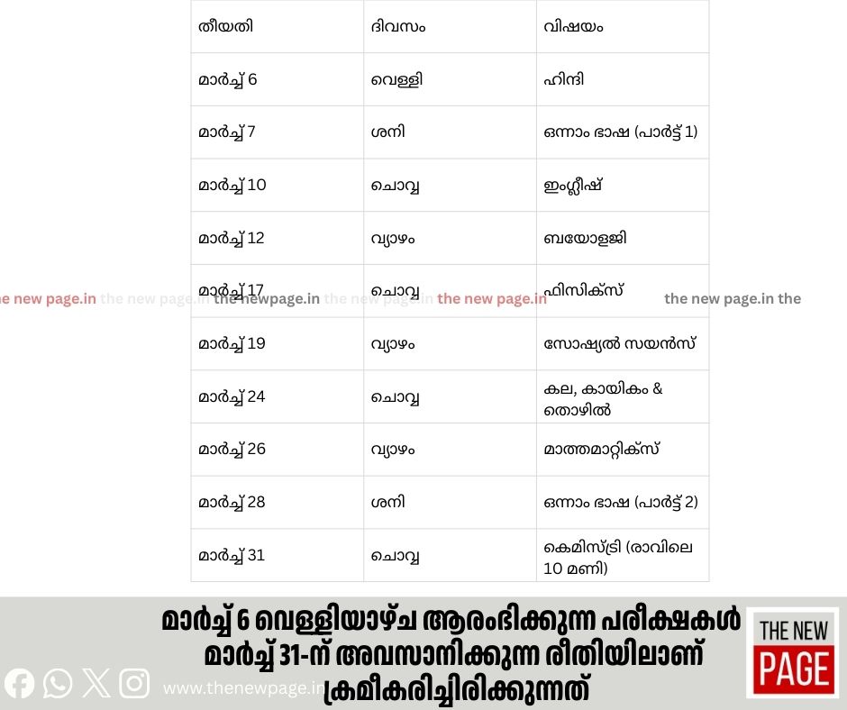 • ​സമയക്രമം: വെള്ളിയാഴ്ച പരീക്ഷകൾ ഉച്ചയ്ക്ക് 2 മണിക്ക് ആരംഭിക്കുമ്പോൾ മറ്റ് ദിവസങ്ങളിൽ 1:30-നാണ് തുടങ്ങുക. എന്നാൽ അവസാന ദിവസമായ മാർച്ച് 31-ന് കെമിസ്ട്രി പരീക്ഷ രാവിലെ 10 മണിക്ക് ആയിരിക്കും നടക്കുക.