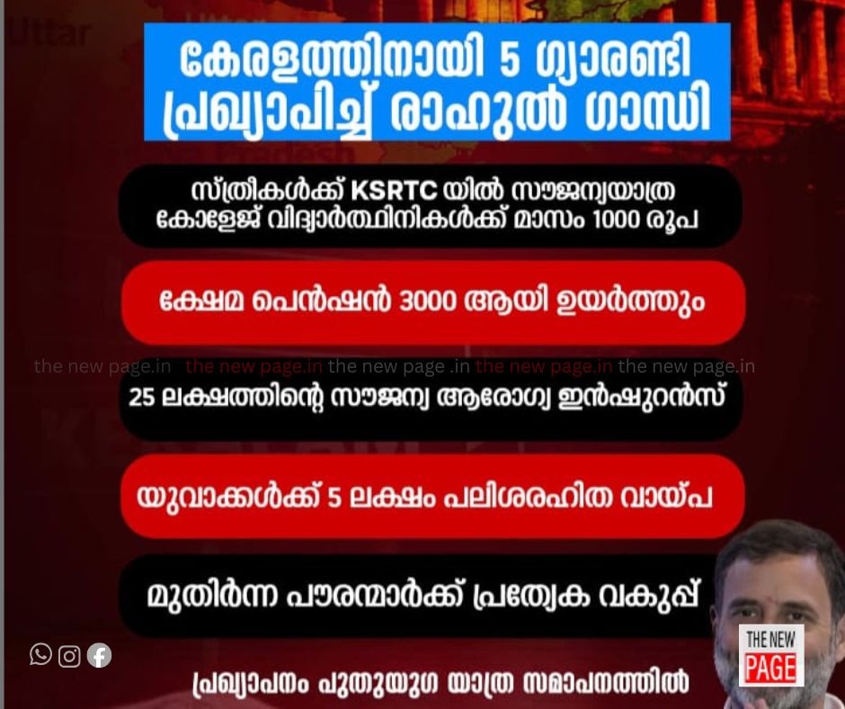 കേരളത്തിൽ യുഡിഎഫ് അധികാരത്തിൽ വന്നാൽ സ്ത്രീകൾക്ക് കെഎസ്ആർടിസി ബസ്സിൽ സൗജന്യ യാത്ര അനുവദിക്കുമെന്ന് കോൺഗ്രസ് നേതാവ് രാഹുൽ ഗാന്ധി പ്രഖ്യാപിച്ചു. കോളേജ് വിദ്യാർഥിനികൾക്ക് പ്രതിമാസം ആയിരം രൂപ നൽകും. ക്ഷേമപെൻഷൻ 3000 രൂപയായി ഉയർത്തും. എല്ലാവർക്കും 25 ലക്ഷത്തിന്റെ സൗജന്യ ഇൻഷുറൻസ് ഏർപ്പെടുത്തും. യുവാക്കൾക്ക് അഞ്ച് ലക്ഷം പലിശരഹിത വായ്പ അനുവദിക്കും. മുതിർന്ന പൗരന്മാർക്കായി പ്രത്യേക വകുപ്പ് ഏർപ്പെടുത്തും.