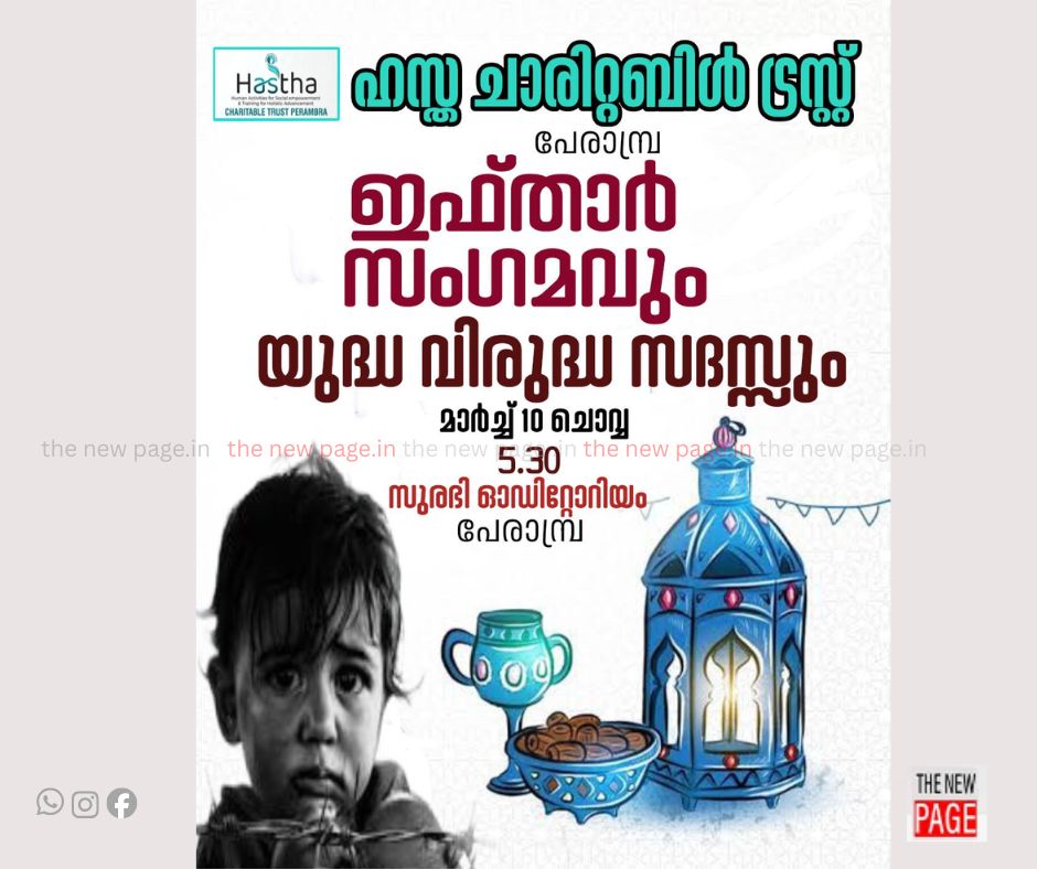 പേരാമ്പ്രയിലെ ജീവകാരുണ്യ പാലിയേറ്റിവ് വിദ്യാഭ്യാസ മേഖലയിലെ സജീവ സാന്നിധ്യമായ ഹസ്ത ചാരിറ്റബിൾ ട്രസ്റ്റ് പേരാമ്പ്ര ഇഫ്താർ സംഗമവും യുദ്ധ വിരുദ്ധ സദസ്സും സംഘടിപ്പിക്കുന്നു. 2026 മാർച്ച് 10 ചൊവ്വ വൈകീട്ട് 5 മണിക്ക് പേരാമ്പ്ര സുരഭി ഓഡിറ്റോറിയത്തിൽ വെച്ചാണ് നടക്കുന്നത്.