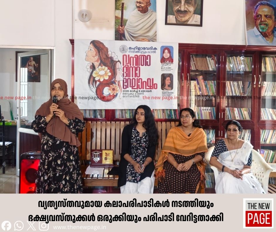 വേറിട്ടതും വ്യത്യസ്തവുമായ കലാപരിപാടികൾ നടത്തിയും ഭക്ഷ്യവസ്തുക്കൾ ഒരുക്കിയും മഹിളാ വേദിക നരിക്കൂട്ടുംചാലിൻ്റെ ആഭിമുഖ്യത്തിൽ വനിതാ ദിനാഘോഷം. കുന്നുമ്മൽ ബ്ലോക്ക് പഞ്ചായത്ത് അംഗം ഇ.പി. സാജിദ ഉദ്ഘാടനം ചെയ്തു. കെ. പി. റീജ അദ്ധ്യക്ഷയായി. മിമിക്രി ഓട്ടംതുള്ളൽ സംസ്ഥാന സ്കൂൾ വിജയി യുക്ത അനിൽ മുഖ്യാതിഥിയി. പി.ബി. പ്രവീണ, അശ്വതി സിദ്ധാർത്ഥ് തുടങ്ങിയവർ സംസാരിച്ചു. ജാനു, സരള, കാർത്യായനി, സുമതി, രേണുക പ്രകാശൻ തുടങ്ങിയവർ കലാപരിപാടികൾ അവതരിപ്പിച്ചു.