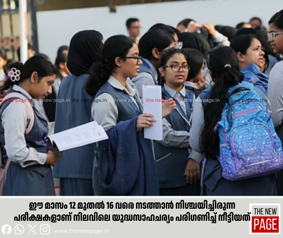 ഗൾഫ് രാജ്യങ്ങളിൽ നടക്കാനിരുന്ന സിബിഎസ്ഇ പന്ത്രണ്ടാം ക്ലാസ് പരീക്ഷകൾ ഇന്നലെ വീണ്ടും മാറ്റിവെക്കുകയായിരുന്നു. ഈ മാസം 12 മുതൽ 16 വരെ നടത്താൻ നിശ്ചയിച്ചിരുന്ന പരീക്ഷകളാണ് നിലവിലെ യുദ്ധസാഹചര്യം പരിഗണിച്ച് നീട്ടിയത്. മേഖലയിൽ സംഘർഷം കടുക്കുന്ന സാഹചര്യത്തിൽ വിദ്യാർത്ഥികളുടെയും അധ്യാപകരുടെയും സുരക്ഷ മുൻനിർത്തിയാണ് സിബിഎസ്ഇ ബോർഡിന്റെ ഈ തീരുമാനം.