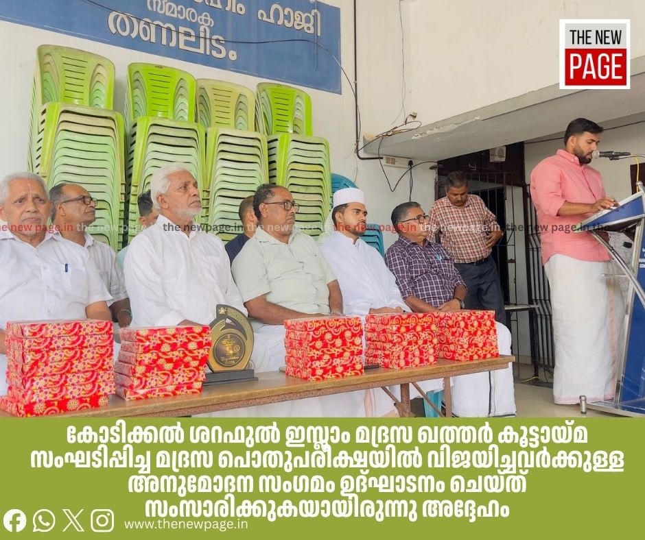 പുതിയ കാലത്ത് മദ്രസ സംവിധാനം ശക്തിപ്പെടുത്തണമെന്നും മത വിദ്യാഭ്യാസത്തിൽ വിദ്യാർത്ഥികളെ പ്രാപ്തമാക്കണമെന്നും പന്തലായനി ബ്ലോക്ക് പഞ്ചായത്ത് മെംബർ പി.കെ മുഹമ്മദലി. കോടിക്കൽ ശറഫുൽ ഇസ്ലാം മദ്രസ ഖത്തർ കൂട്ടായ്മ സംഘടിപ്പിച്ച മദ്രസ പൊതുപരീക്ഷയിൽ വിജയിച്ചവർക്കുള്ള അനുമോദന സംഗമം ഉദ്ഘാടനം ചെയ്ത് സംസാരിക്കുകയായിരുന്നു അദ്ദേഹം. പി ബഷീർ അധ്യക്ഷത വഹിച്ചു. കുഞ്ഞബ്ദുള്ള എൻ. കെ,ഹാഷിം മാസ്റ്റർ, ഷഫീഖ് സംസം, ഇസ്മായിൽ അൻവരി, മുഹമ്മദ് കുട്ടി ദാരിമി, നസീർ എഫ് എം സംസാരിച്ചു. മന്നത്ത് മജീദ് സ്വാഗതവും റിയാസ് എം.വി നന്ദിയും പറഞ്ഞു. പൊതു പരീക്ഷയിൽ ഉന്നത വിജയികൾക്ക് പ്രത്യേക ക്യാഷ് അവാർഡ് നൽകി ആദരിച്ചു.