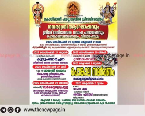 Moreകൊയിലാണ്ടി പയറ്റുവളപ്പിൽശ്രീദേവി ക്ഷേത്രത്തിൽ നവരാത്രി ആഘോഷത്തിന്റെ ഭാഗമായി ശ്രീമദ് ദേവീ ഭാഗവത നവാഹപാരായണവും, പൊങ്കാല സമർപ്പണവും നവാഹ പാരായണ യജ്ഞം എന്നിവ ആരംഭിച്ചു. വിജയദശമി വരെ വിവിധങ്ങളായ പുജകളും, പ്രത്യേക