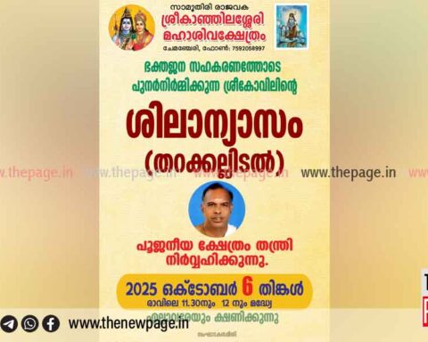 Moreകാഞ്ഞിലശ്ശേരി മഹാശിവക്ഷേത്രത്തിലെ ശ്രീ കോവിൽ പുനർനിർമ്മാണത്തിന്റെ ഭാഗമായുള്ള ശിലാന്യാസം ഒക്ടോബർ 6ന് നടക്കും. രാവിലെ 11:20 നും 12 നുംമധ്യേയുള്ള മുഹൂർത്തത്തിൽ ക്ഷേത്രം തന്ത്രി മേൽപ്പള്ളി മന ഉണ്ണികൃഷ്ണൻ അടിതിരിപ്പാട്